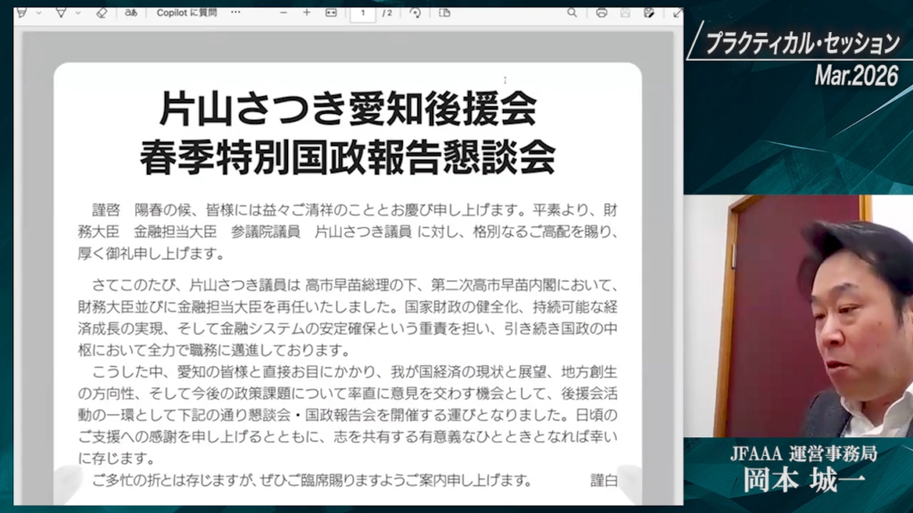 片山さつき顧問の「春季特別国政報告懇談会」などについてご案内しました。